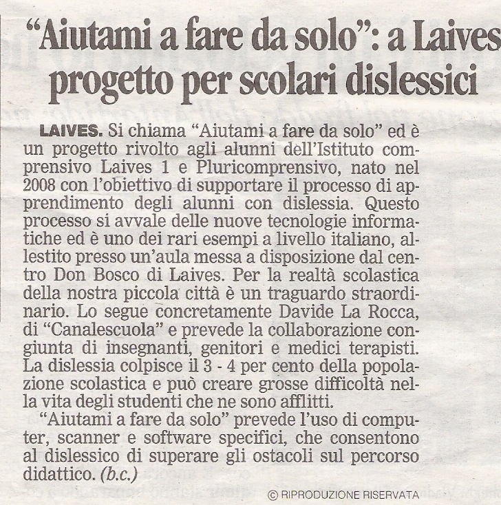 Dall'anno scolastico 2008/2009 è stato attivato il primo laboratorio dedicato agli alunni dell'Istituto Comprensivo Laives 1, vero pioniere dell'iniziativa, presso il Centro Don Bosco di via Kennedy a Laives. In seguito ha aderito al progetto anche l'altro Istituto di Laives, ovvero l'Istituto Pluricomprensivo Laives. Con una costante progettualità e con un impegno assiduo delle parti e dei finanziatori, il laboratorio accoglie in pianta stabile circa 15 alunni con DSA delle scuole della città di Laives (alunni dalla 4 classe primaria alla 3 secondaria di 1° grado). Il laboratorio segue gli alunni dai primi mesi di scuola accompagnando i ragazzi di terza media fino agli esami di Stato. Ogni alunno ha la possibilità di lavorare in un piccolo gruppo, seguito da un operatore, per due incontri da 1,30 ora alla settimana.