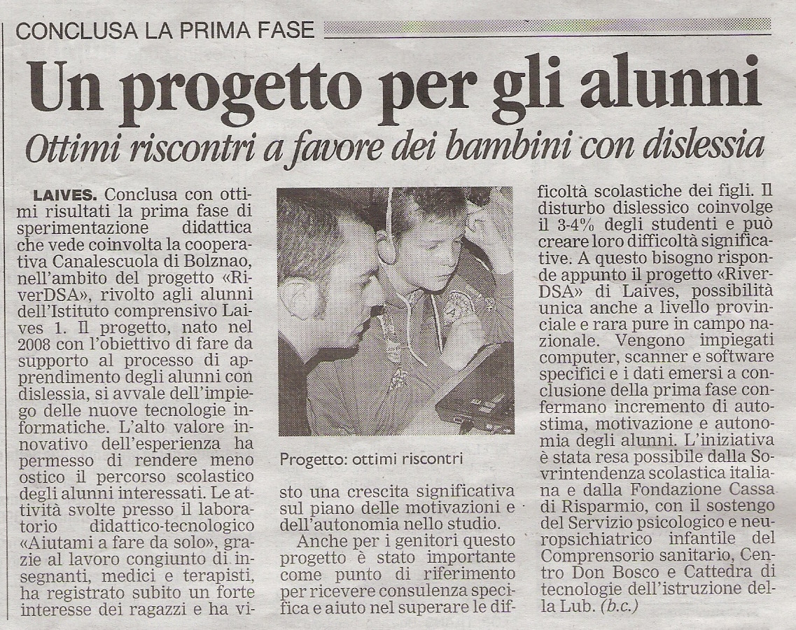 è un’iniziativa promossa da Canalescuola rivolta agli alunni altoatesini con Disturbi Specifici dell’Apprendimento. "RiverDSA" è un progetto pensato per dare supporto fattivo e operativo agli alunni, alle famiglie e alle scuole. "Aiutami a fare da solo" è un laboratorio pomeridiano extrascolastico dove bambini e ragazzi hanno la possibilità di essere seguiti da personale specializzato nello svolgimento dei compiti scolastici, nello studio e nella costruzione di un metodo di studio basato sulla valorizzazione delle abilità personali. Nei laboratori gli alunni, i genitori e gli insegnanti trovano supporto e accoglienza da parte di giovani professionisti nell’ambito della didattica speciale e della psicopedagogia. In questi laboratori vengono così realizzate attività in piccoli gruppi, tutte le attività proposte sono di carattere didattico e tengono conto del contesto socio-culturale-affettivo in cui vive ogni singolo bambino-ragazzo. Le attività sono finalizzate all’autonomia nello studio del bambino-ragazzo con DSA, ad un uso autonomo degli strumenti compensativi, degli strumenti tecnologici e in generale dei supporti didattici.