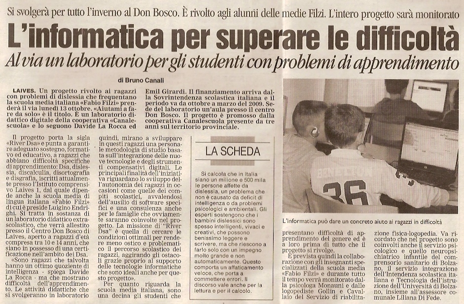 è un’iniziativa promossa da Canalescuola rivolta agli alunni altoatesini con Disturbi Specifici dell’Apprendimento. "RiverDSA" è un progetto pensato per dare supporto fattivo e operativo agli alunni, alle famiglie e alle scuole. "Aiutami a fare da solo" è un laboratorio pomeridiano extrascolastico dove bambini e ragazzi hanno la possibilità di essere seguiti da personale specializzato nello svolgimento dei compiti scolastici, nello studio e nella costruzione di un metodo di studio basato sulla valorizzazione delle abilità personali. Nei laboratori gli alunni, i genitori e gli insegnanti trovano supporto e accoglienza da parte di giovani professionisti nell’ambito della didattica speciale e della psicopedagogia. In questi laboratori vengono così realizzate attività in piccoli gruppi, tutte le attività proposte sono di carattere didattico e tengono conto del contesto socio-culturale-affettivo in cui vive ogni singolo bambino-ragazzo. Le attività sono finalizzate all’autonomia nello studio del bambino-ragazzo con DSA, ad un uso autonomo degli strumenti compensativi, degli strumenti tecnologici e in generale dei supporti didattici.