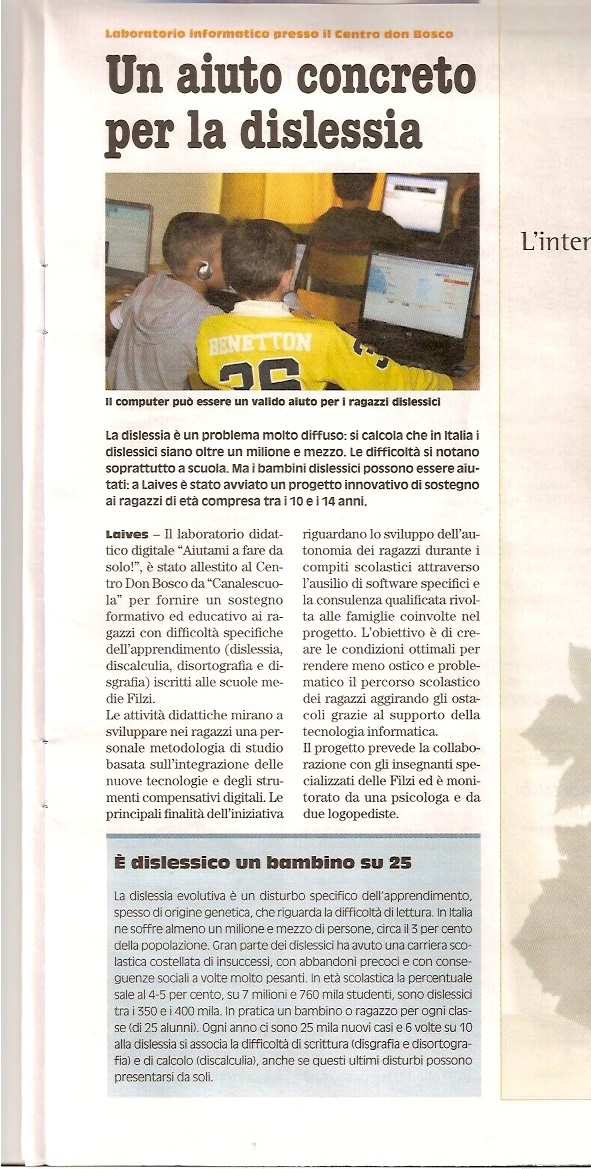 Dall'anno scolastico 2008/2009 è stato attivato il primo laboratorio dedicato agli alunni dell'Istituto Comprensivo Laives 1, vero pioniere dell'iniziativa, presso il Centro Don Bosco di via Kennedy a Laives. In seguito ha aderito al progetto anche l'altro Istituto di Laives, ovvero l'Istituto Pluricomprensivo Laives. Con una costante progettualità e con un impegno assiduo delle parti e dei finanziatori, il laboratorio accoglie in pianta stabile circa 15 alunni con DSA delle scuole della città di Laives (alunni dalla 4 classe primaria alla 3 secondaria di 1° grado). Il laboratorio segue gli alunni dai primi mesi di scuola accompagnando i ragazzi di terza media fino agli esami di Stato. Ogni alunno ha la possibilità di lavorare in un piccolo gruppo, seguito da un operatore, per due incontri da 1,30 ora alla settimana.
